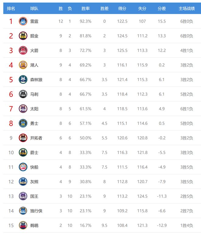 今日比赛后除了雷霆、掘金、太阳、爵士、独行侠、鹈鹕排名不变外,其他9支球队排名互换。